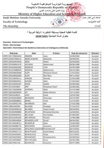 Département d’Électronique – Liste des étudiants concernés par le concours de doctorat 2025/2026 11 janvier 2026 Lire plus»