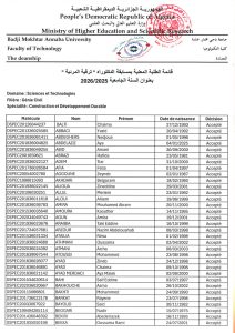 Département de Génie Civil – Liste des étudiants concernés par le concours de doctorat 2025/2026 12 janvier 2026 Lire plus»